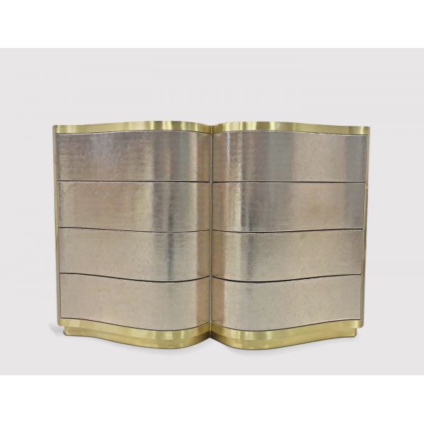 Upholstered in leather outlined by metal bands, this piece exudes modern vintage glamour.