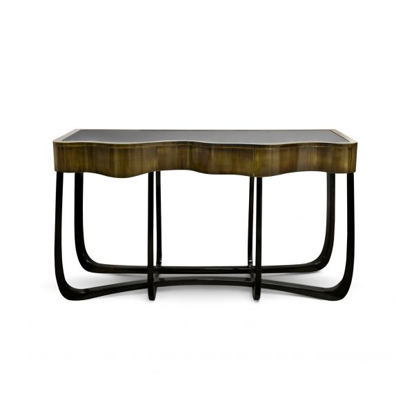 Console with a handcrafted structure made from mahogany with a high gloss black lacquer finish. Contains three drawers finished with polished brass.