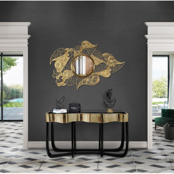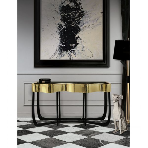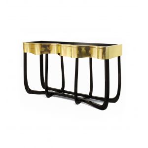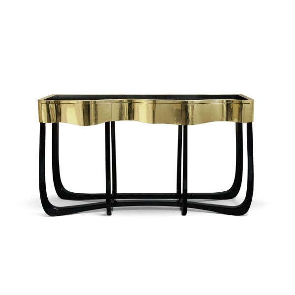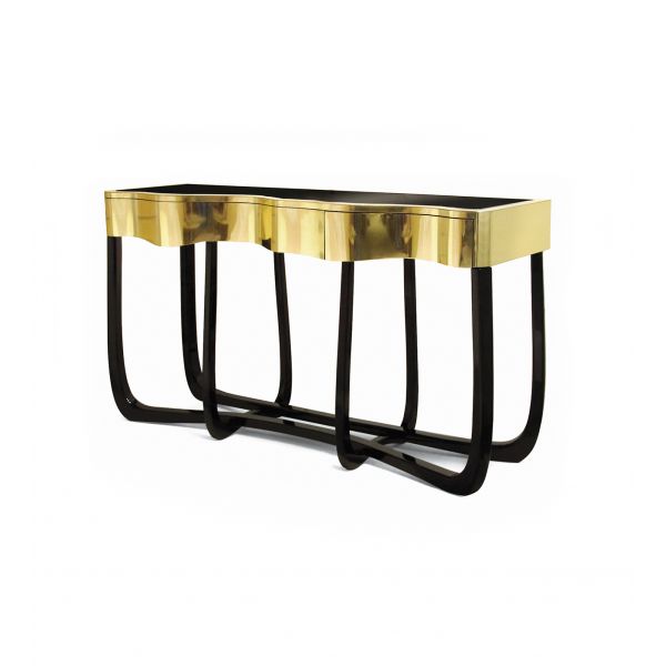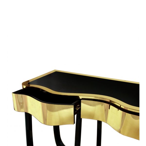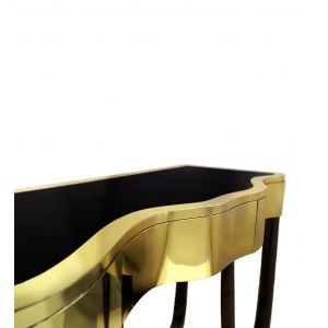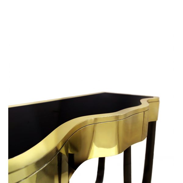 Console with a handcrafted structure made from mahogany with a high gloss black lacquer finish. Contains three drawers finished with polished brass.