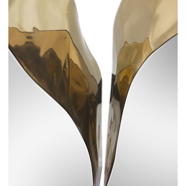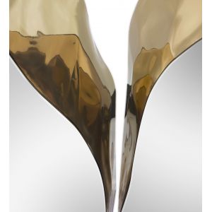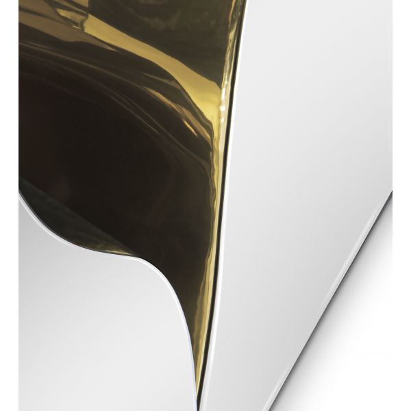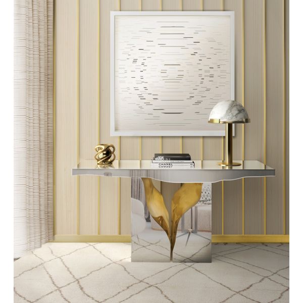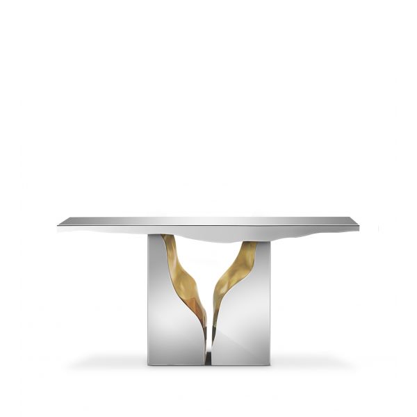 The Console features a mahogany structure, with its inside finished in polished brass, and an exterior finished in polished stainless steel. It's organic features are achieved through the manual fitting of the polished brass sheet.