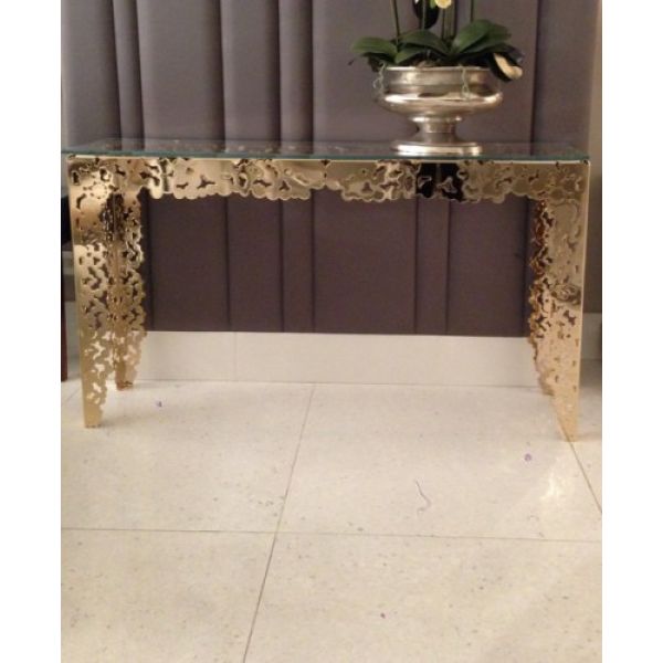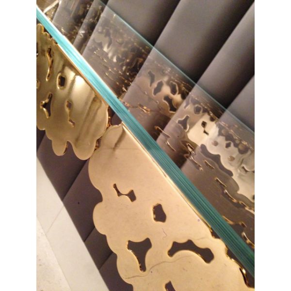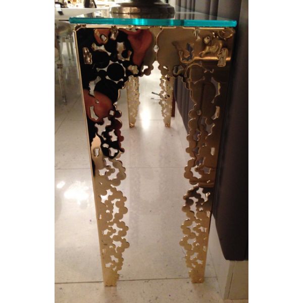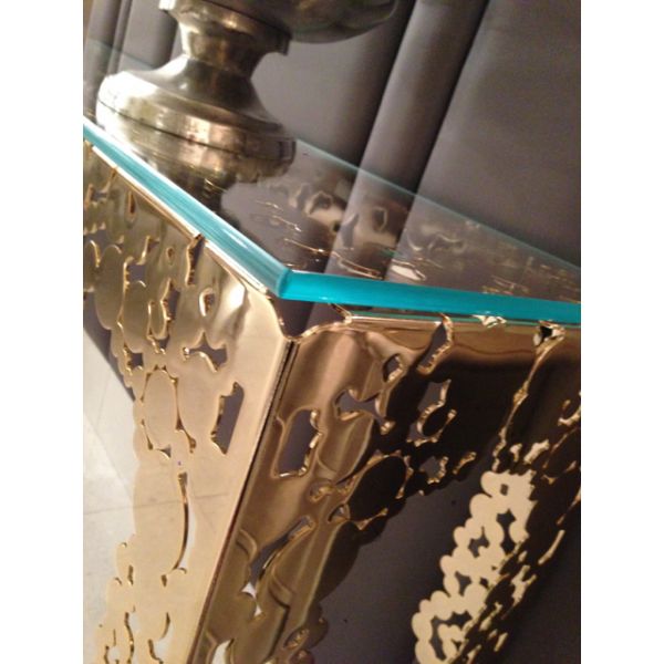 Gold bubbles designer console shown here finished in polished gold with a clear glass top. Available to order in alternative sizes and with solid or marble tops. As shown height 80 cm x width 140 cm x depth 35 cm. Other items in this collection include a