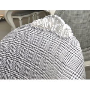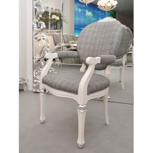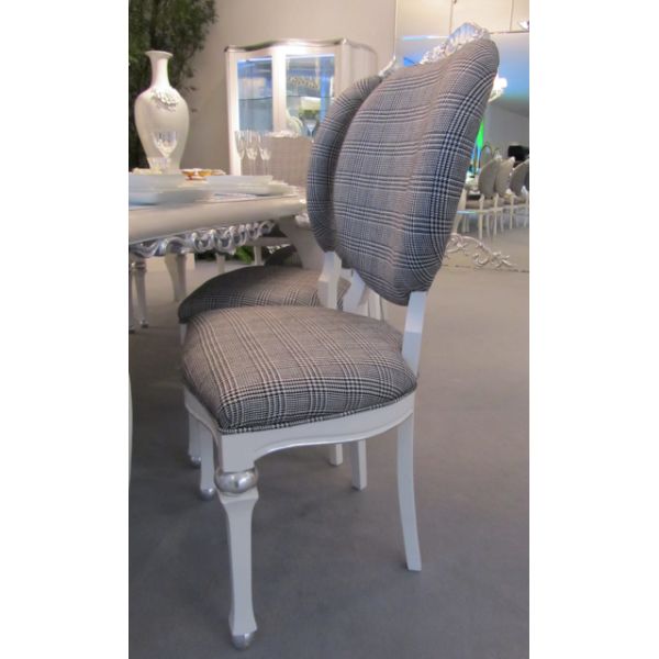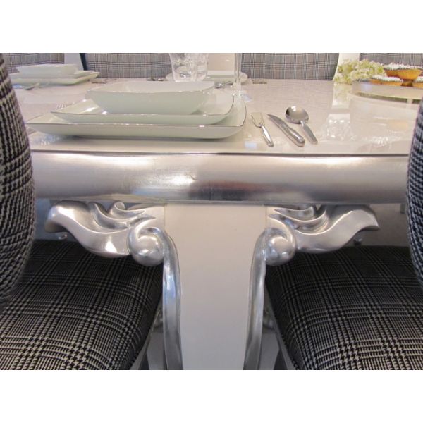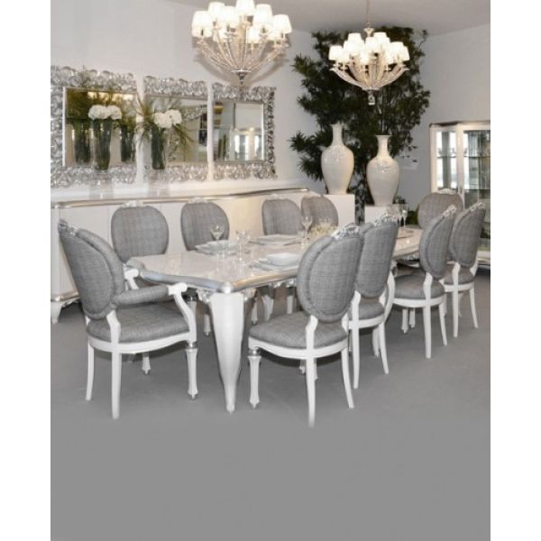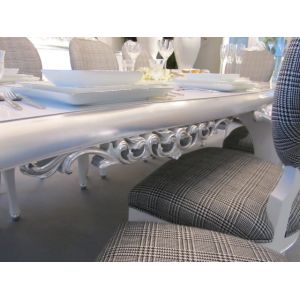 Modern Glamour Collection white lacquered dining table and chairs. Hand carved from solid wood with subtle details finished in silver leaf.